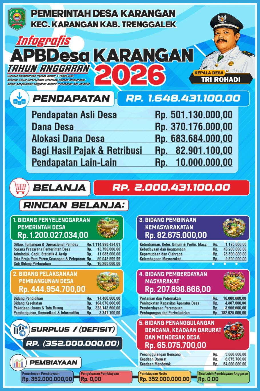 APBDesa Desa Karangan Tahun Anggaran 2026 memiliki total Pendapatan Desa sebesar Rp 1.648.431.100,00 dan total Belanja Desa sebesar Rp 2.000.431.100,00, sehingga terdapat defisit anggaran yang ditutup melalui pembiayaan desa sesuai ketentuan (Rp 352.000.000,00).