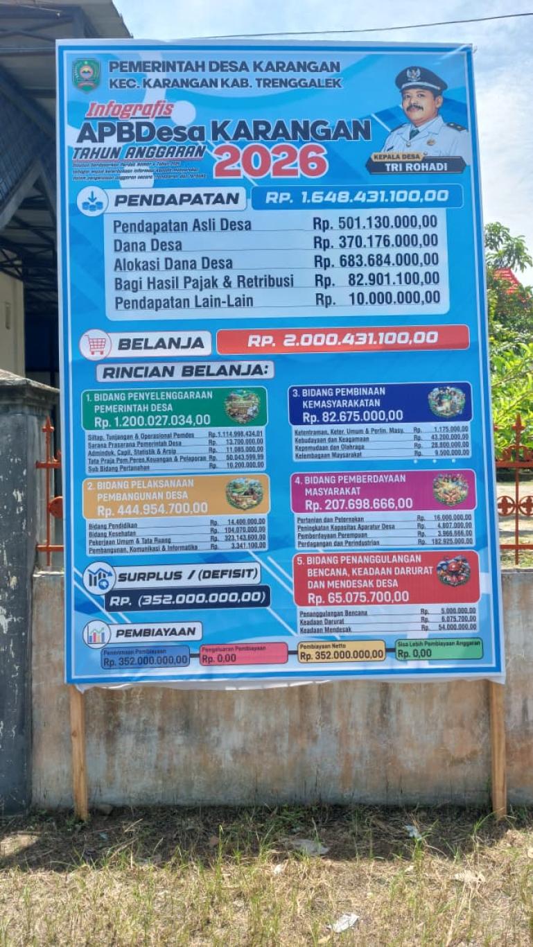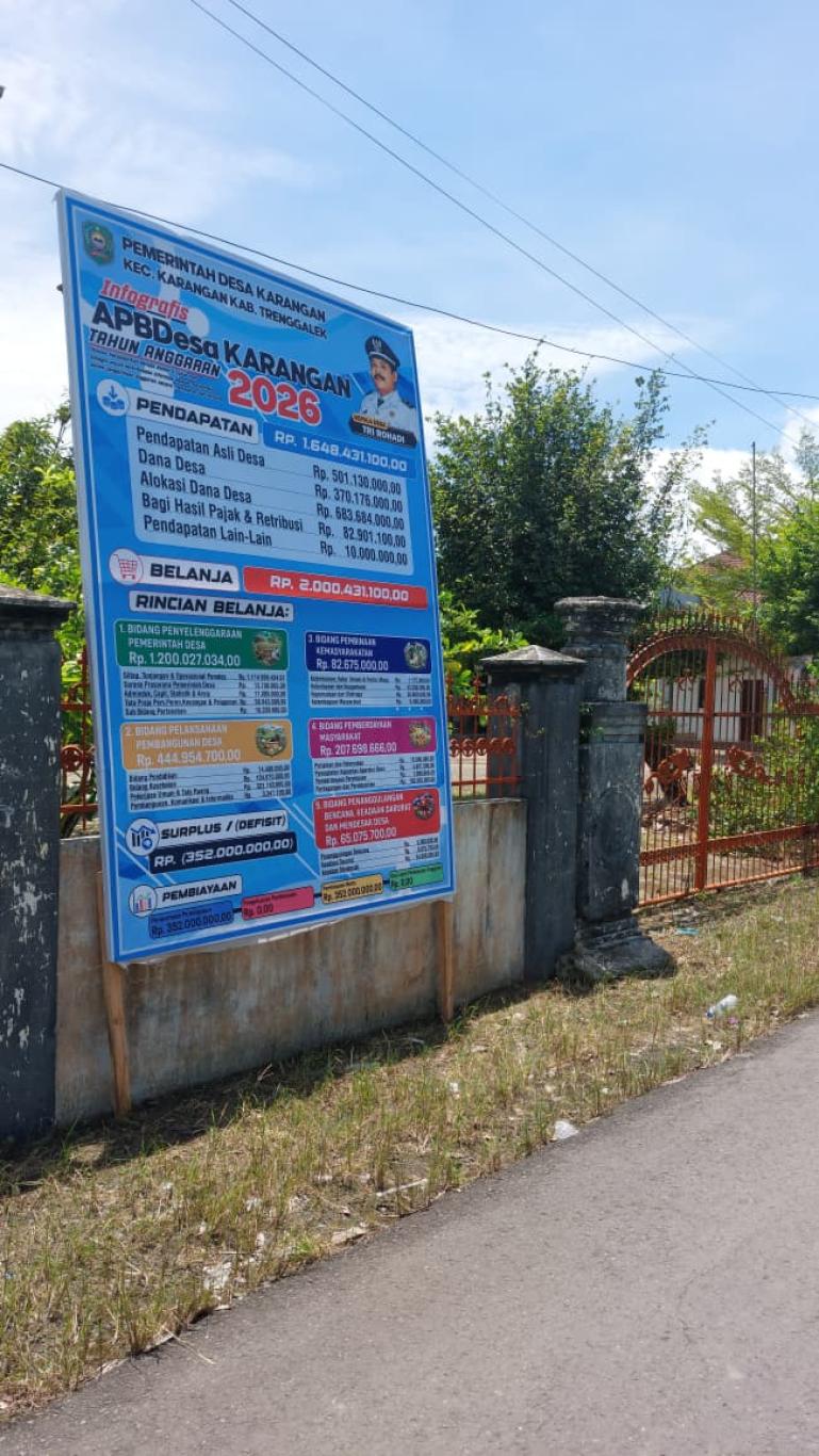 Pemerintah Desa Karangan, Kecamatan Karangan, Kabupaten Trenggalek, telah melaksanakan publikasi Anggaran Pendapatan dan Belanja Desa (APBDesa) Tahun Anggaran 2026 sebagai pelaksanaan asas transparansi dan akuntabilitas pengelolaan keuangan desa.