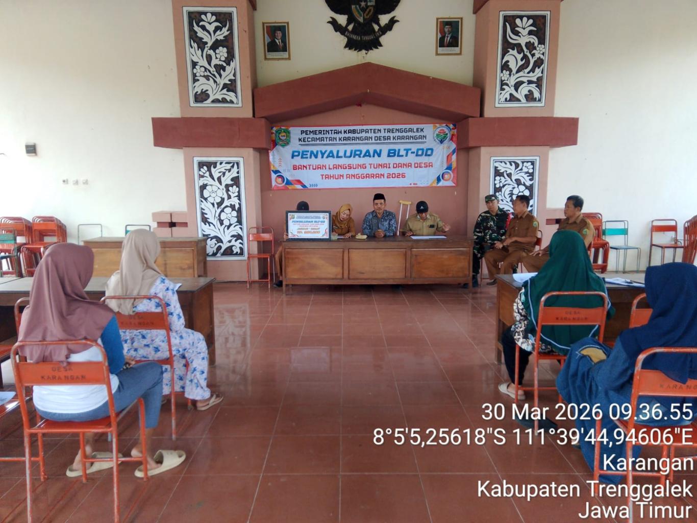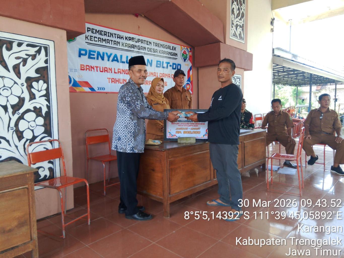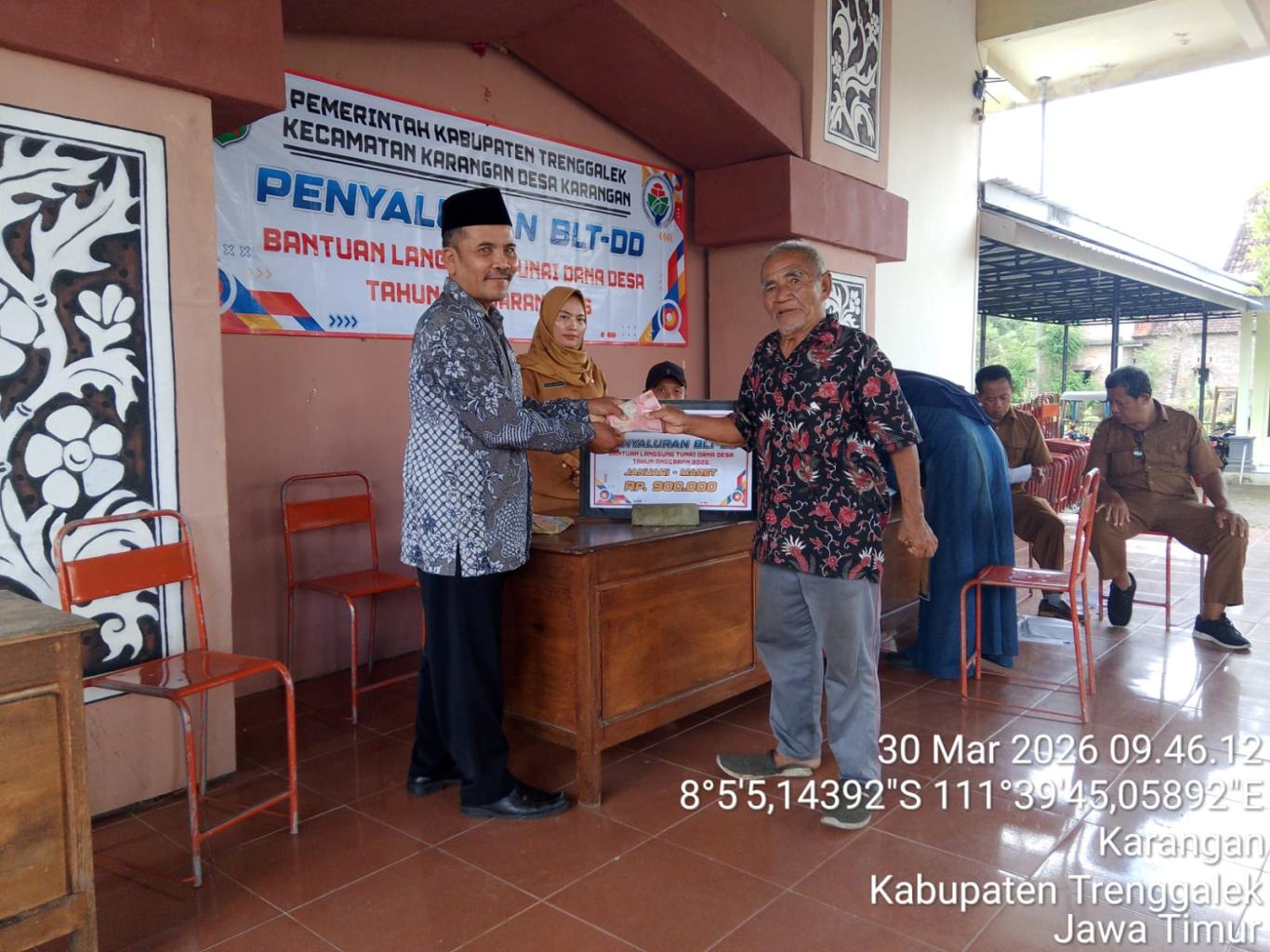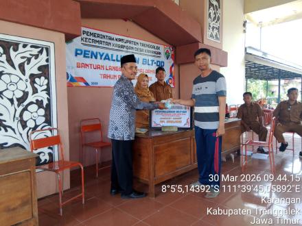 Setelah melalui proses pendataan sampai dengan finalisasi calon KPM BLT DD 2026 melalui MUSDESUS, Pada Senin tanggal 30 Maret 2026 Pemerintah Desa Karangan menyalurkan BLT DD untuk Bulan Januari s/d Maret 2026 kepada 15 KPM yang terpilih. BLT DD rencananya disalurkan sebanyak 12 kali. Untuk KPM yang Sakit/Tidak bisa hadir bisa diambilkan/diwakilkan anggota keluarganya. Penyaluran Pertama BLT-DD dilakukan dan disaksikan oleh Pemerintah Desa, BPD, Tiga Pilar, Perwakilan Kecamatan dan Pendamping Desa di Balai Desa Karangan. Acara berjalan lancar, semoga BLT DD dapat membantu dan bermanfaat bagi para penerima.